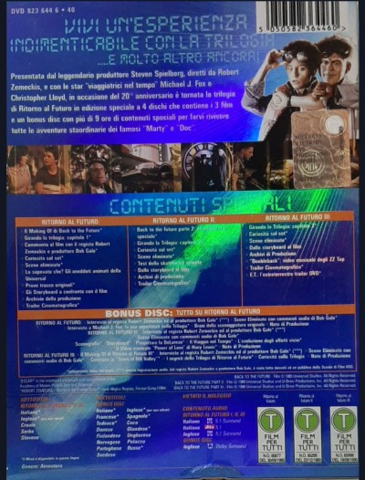 Capolavoro entrato nella storia del Cinema. I Film, di cui alla trilogia, narrano le peripezie dei due protagonisti a cavallo di varie epoche della storia statunitense (il 1955, il 1985, il 2015 e il 1885) affrontate, appunto, dal giovane Marty McFly e dal suo amico, lo stravagante scienziato Emmett "Doc" Brown, inventore di una bizzarra macchina del tempo ricavata da un'autovettura, una DeLorean DMC-12. Nel corso dei tre episodi i due si trovano a risolvere diversi problemi per evitare catastrofici paradossi temporali.
